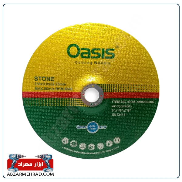 صفحه برش سنگ اوسیس Oasis سایز 230×3 میلی متر یک دیسک برش قدرتمند برای استفاده روی فرز سنگ بری سایز بزرگ است که جهت برش انواع سنگ های ساختمانی طراحی شده است. قطر 230 میلی متر این مدل امکان ایجاد برش های عمیق تر را فراهم می کند و ضخامت 3 میلی متر تعادل مناسبی بین سرعت برش و استحکام صفحه ایجاد می کند.